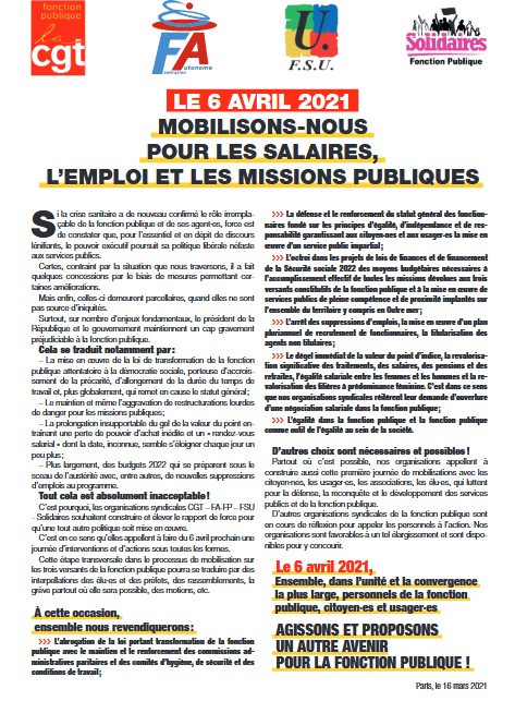 6 avril : préavis de grève 1 avril 2021 cgtnancy préavis de grève Laisser un commentaire Mobilisons-nous pour les salaires, l’emploi et les missions publiques ! https://www.cgtservicespublics.fr/societe/la-fonction-publique/appels-adresses-expressions/article/fonction-publique-le-6-avril-mobilisons-nous-pour-les-salaires-l-emploi-et-les Partager : Partager sur Facebook(ouvre dans une nouvelle fenêtre) Facebook Imprimer(ouvre dans une nouvelle fenêtre) Imprimer Email a link to a friend(ouvre dans une nouvelle fenêtre) E-mail J’aime chargement… Similaire