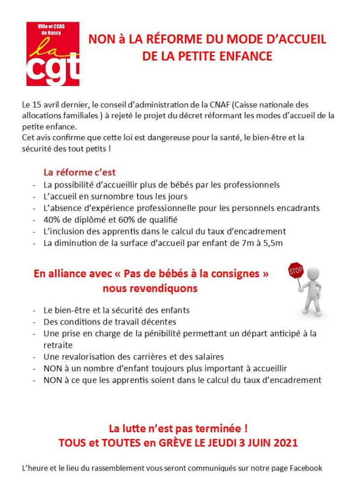 Préavis de grève contre la réforme du mode d’accueil de la petite enfance le jeudi 3 juin 2021.