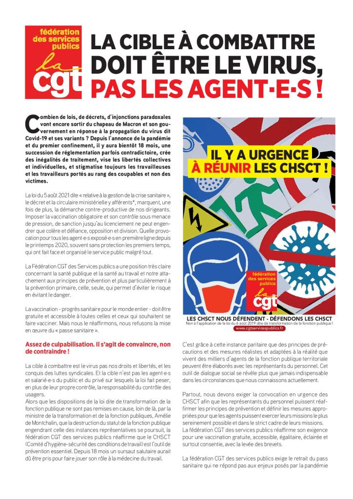 la cible À combattre doit être le virus, pas les agent.e.s ! 26 août 2021 cgtnancy Actualités, Covid-19 Laisser un commentaire Partager : Partager sur Facebook(ouvre dans une nouvelle fenêtre) Facebook Imprimer(ouvre dans une nouvelle fenêtre) Imprimer Email a link to a friend(ouvre dans une nouvelle fenêtre) E-mail J’aime chargement… Similaire