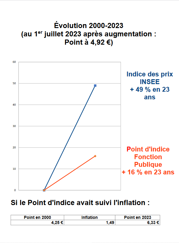 Alors que la perte de pouvoir d’achat depuis juin 2010 marquant le début de la longue période de gel s’élève désormais à plus de 16%, cette mesure de 1,5 % applicable au 1er juillet 2023 est donc largement insuffisante !